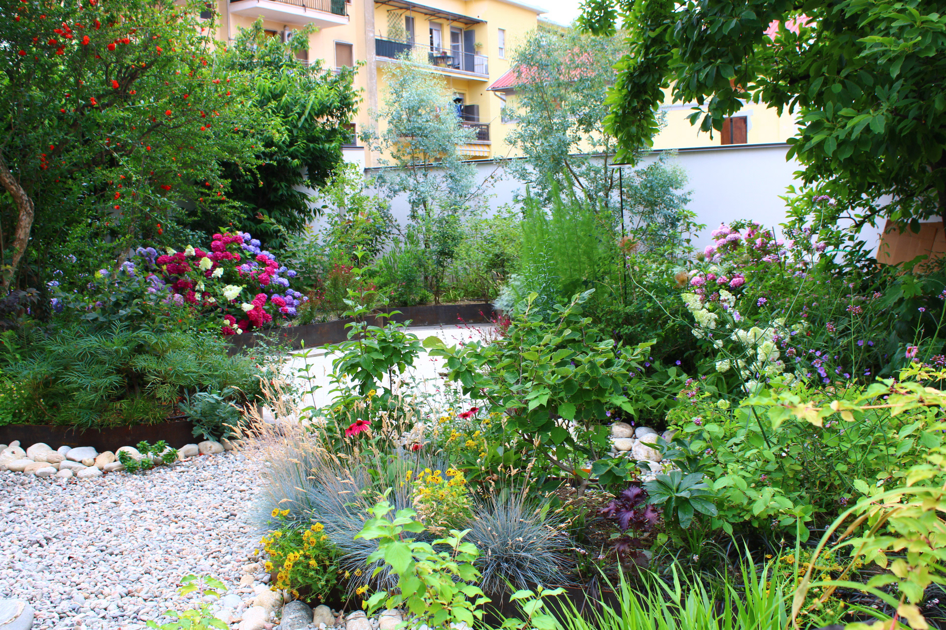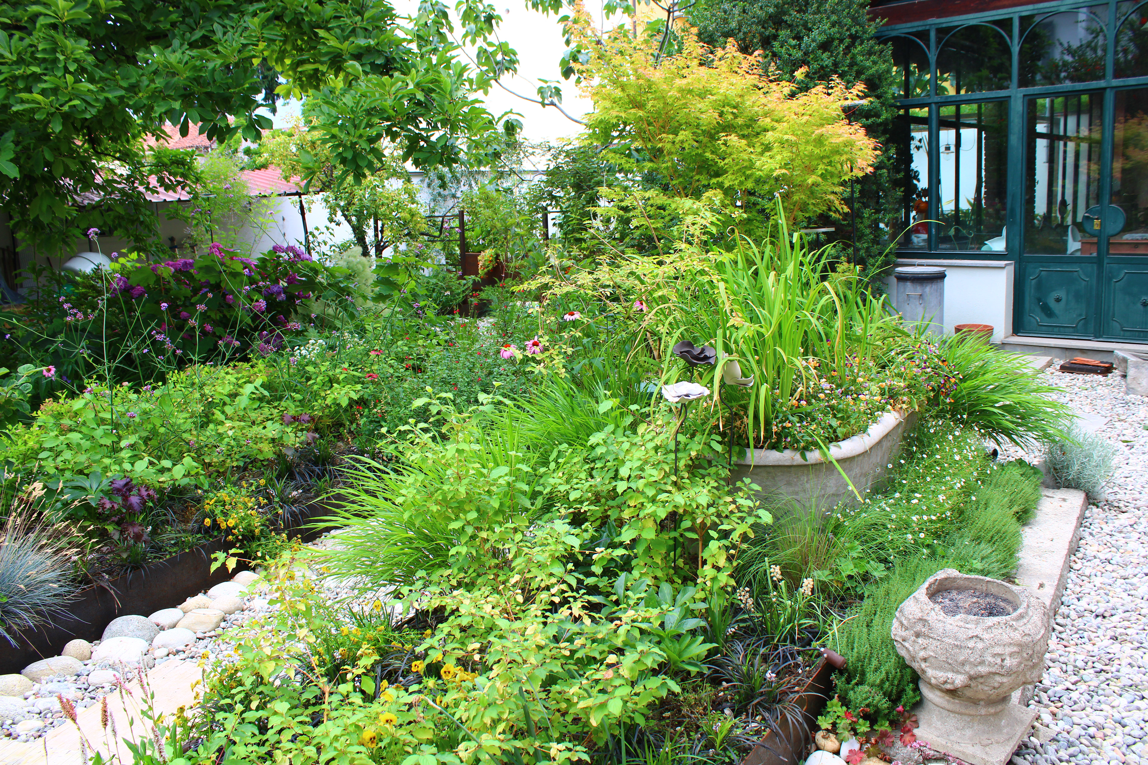 La richiesta iniziale è stata quella di creare un giardino fruibile anche da dentro casa e dal momento che di trova in centro con molte case attorno, aumentare la privacy. Il progetto ha puntato a valorizzare le piante esistenti, integrandole in una composizione con punti di interesse durante tutto l’arco dell’anno