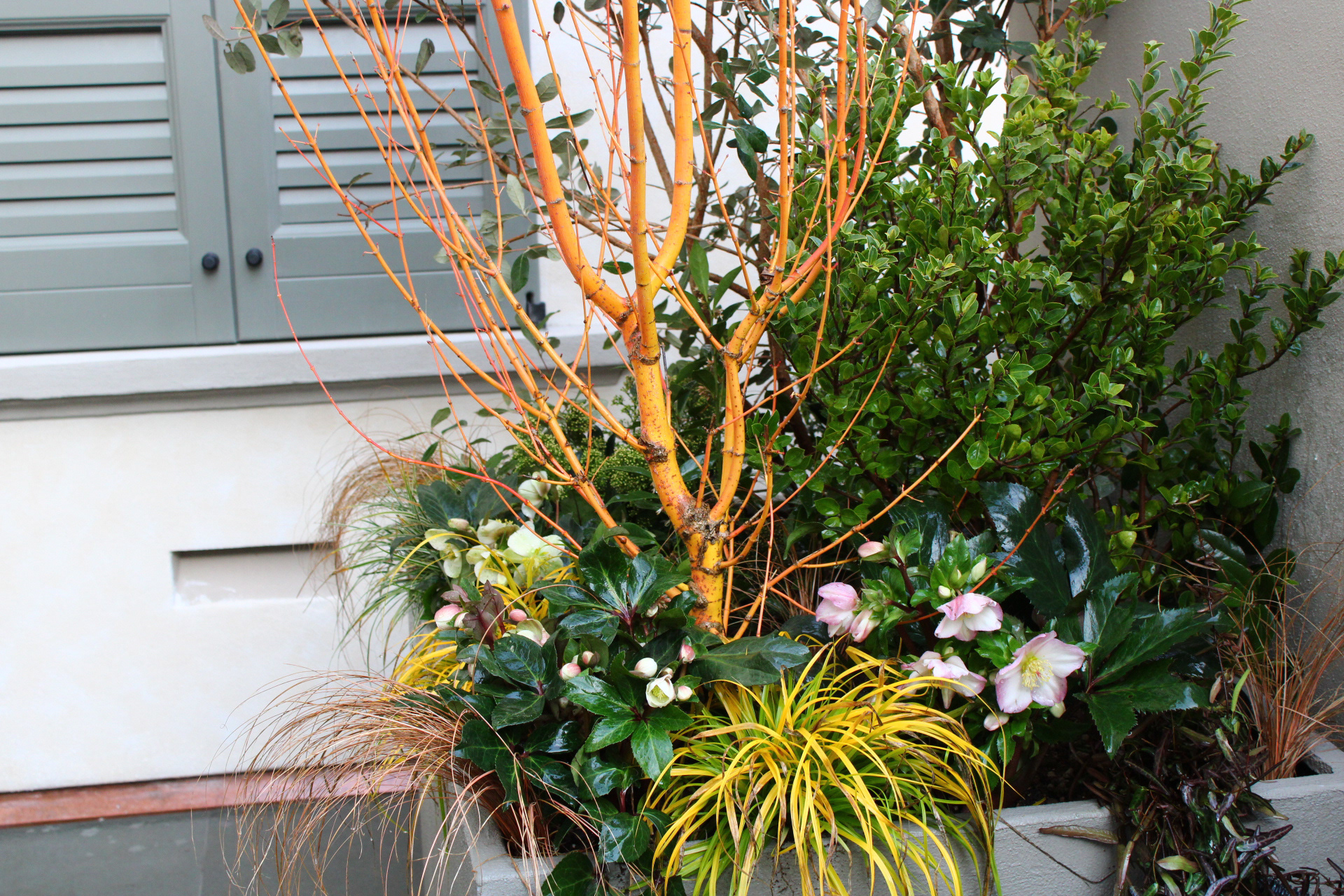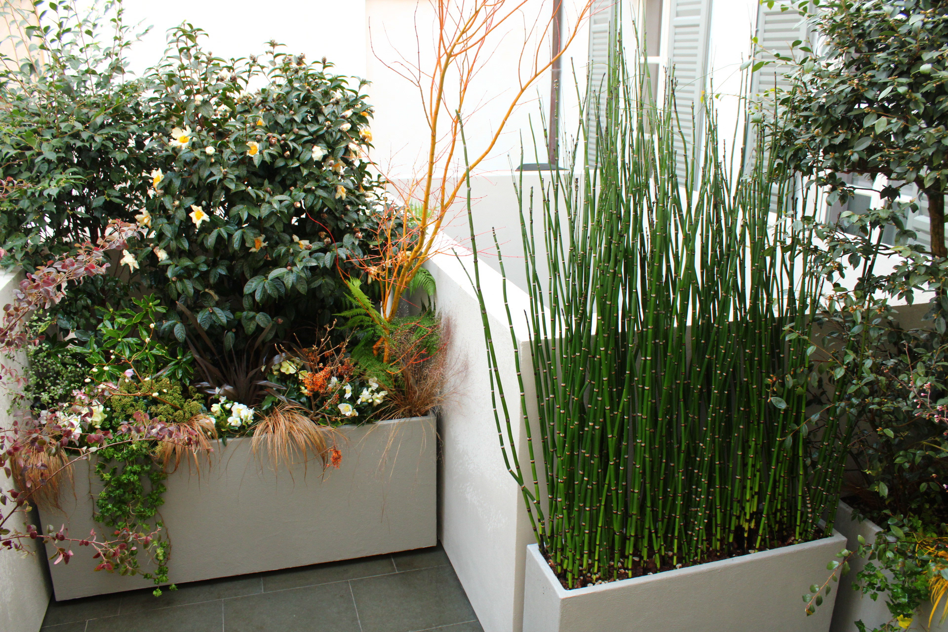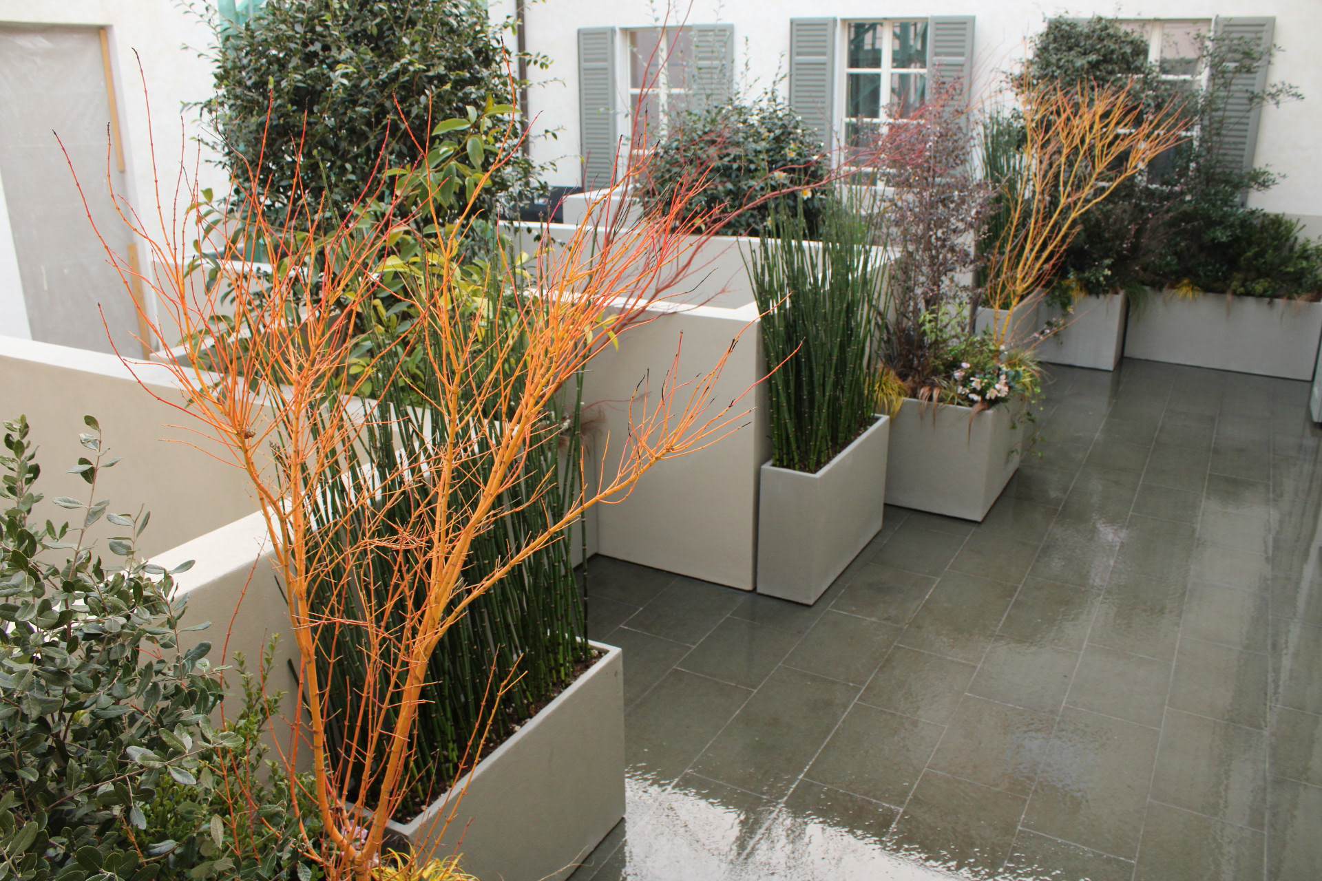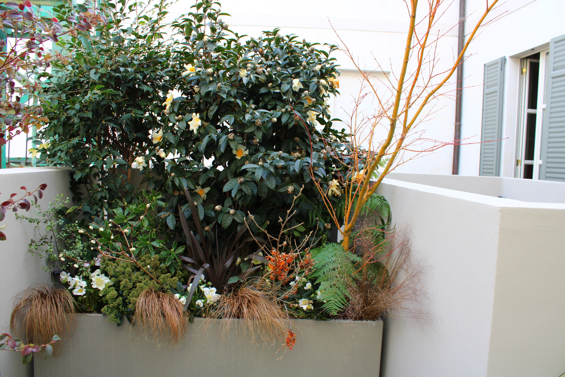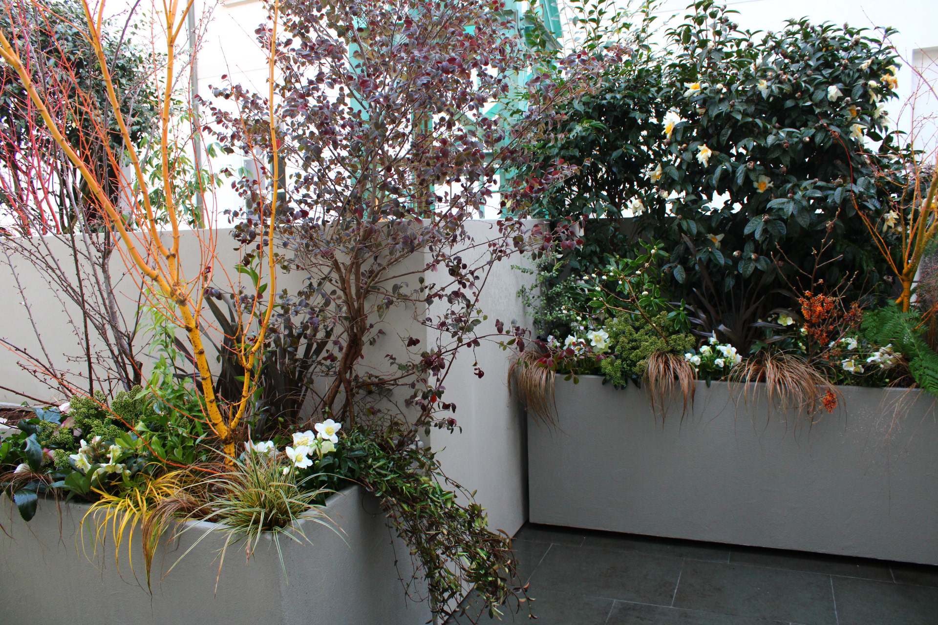 Realizzando su misura delle fioriere in alluminio a finitura cementizia ci siamo integrati con l'edificio, sfruttando il più possibile la conformazione del terrazzo abbiamo creato grandi vasche in cui ospitare le specie più alte e vasche molto strette per ammortizzare i muri. Abbiamo scelto Camellia botaniche a fioritura invernale, aceri da corteccia che colorano l'inverno e Equisetum hyemale per sfruttare gli spazi più piccoli.